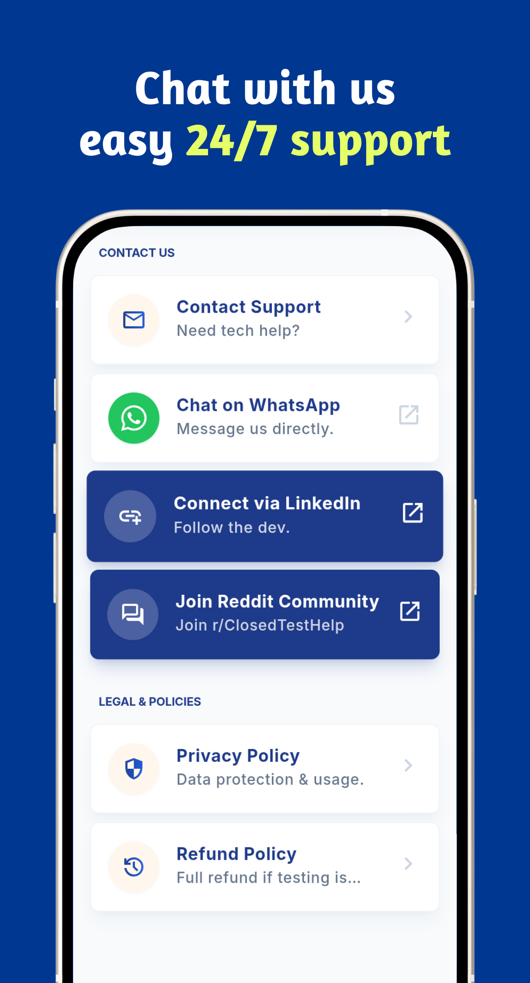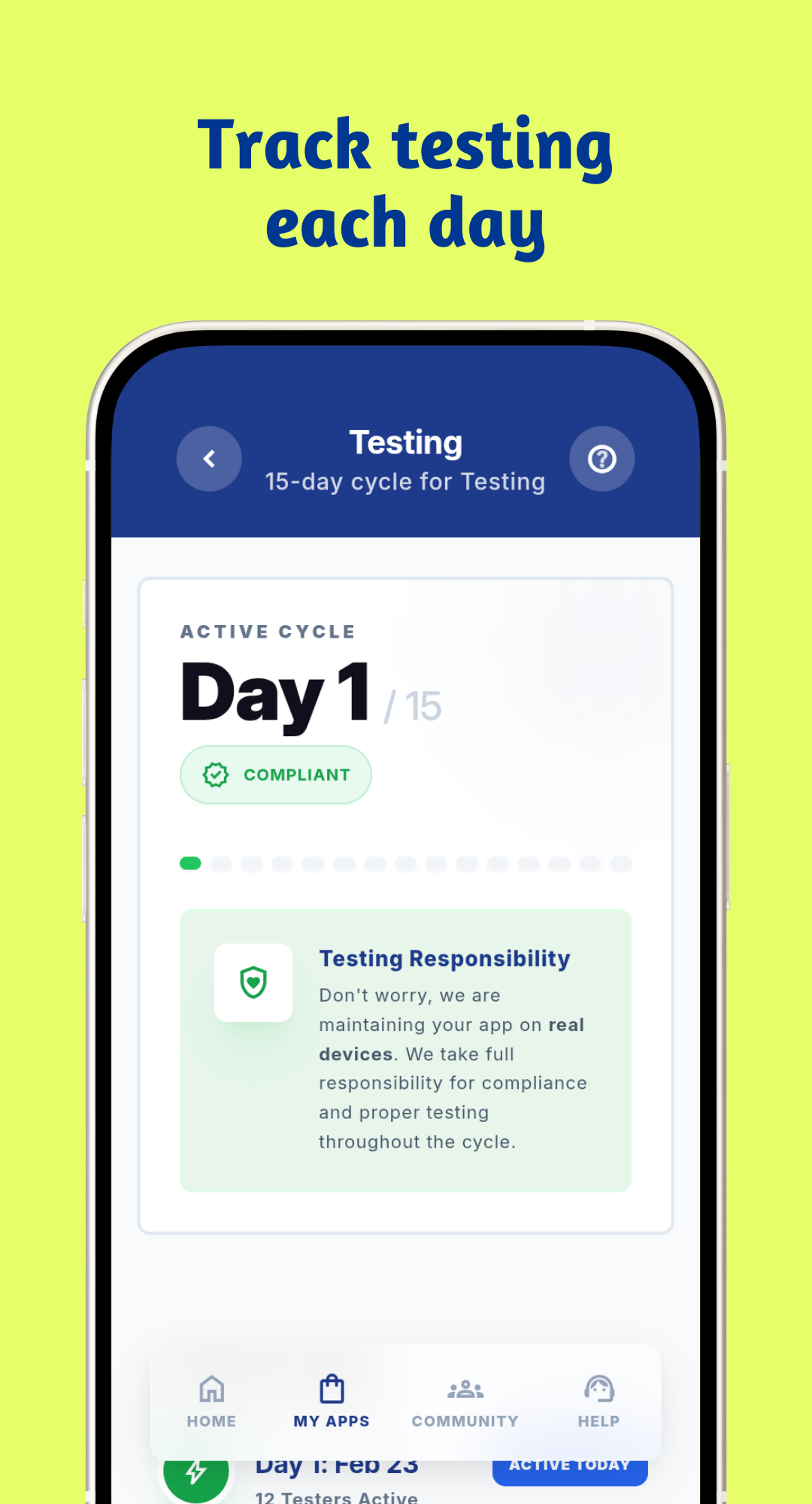 The Google Play requirement is strict: you need at least 12 testers opted-in for 14 days. We automate the connection so you can focus on building your app.