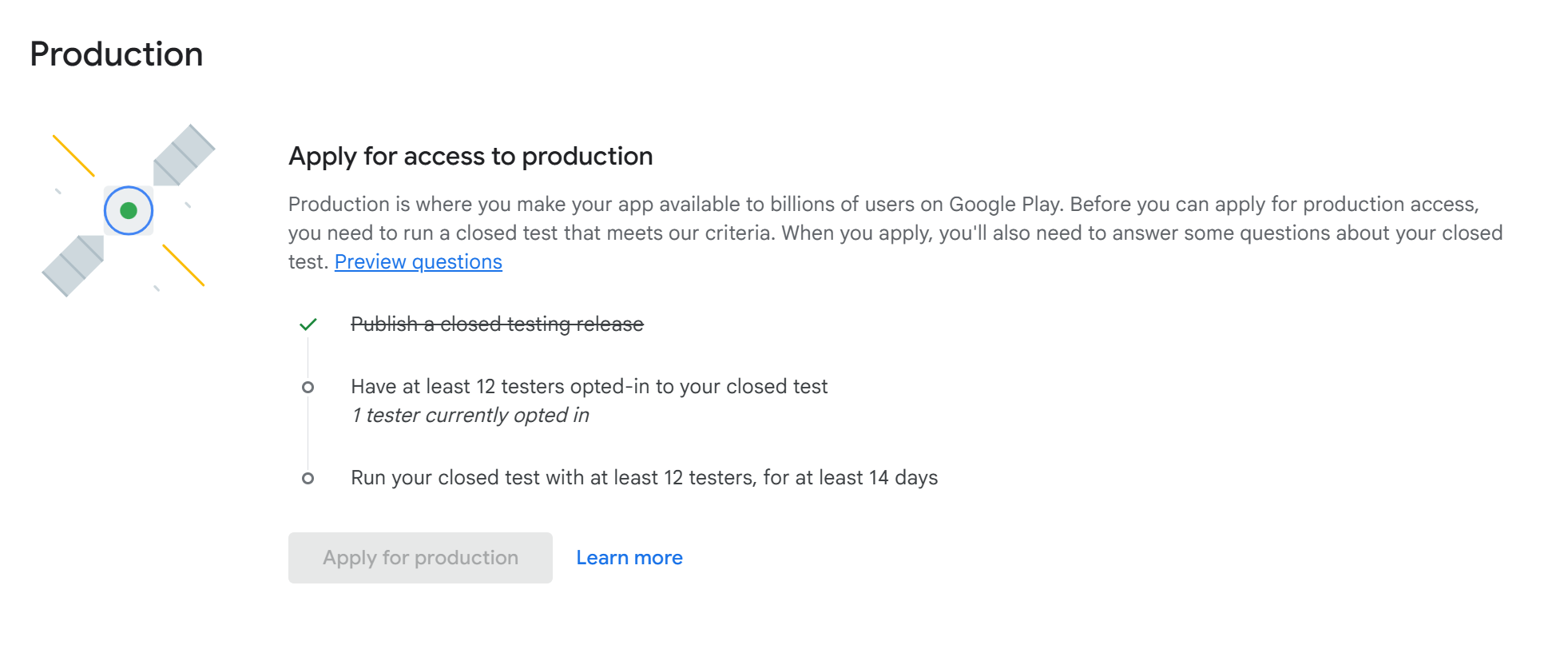 - Run your closed test for 14 days: The dashboard will track the continuous 14-day progress.